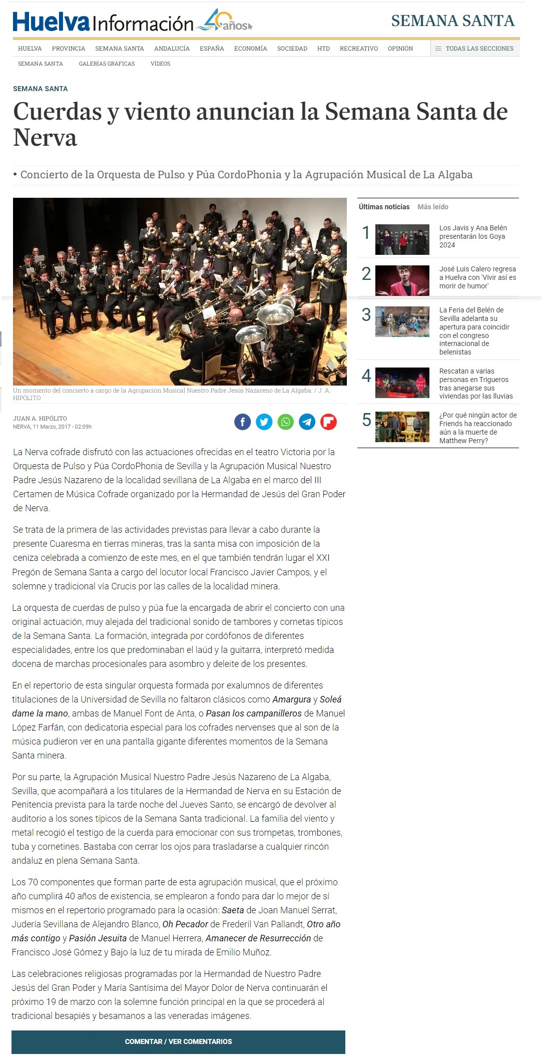 Huelva Información, en su edición digital, se hacía eco de nuestro concierto de Semana Santa en Nerva el 4 de marzo de 2017 ⬇⬇⬇