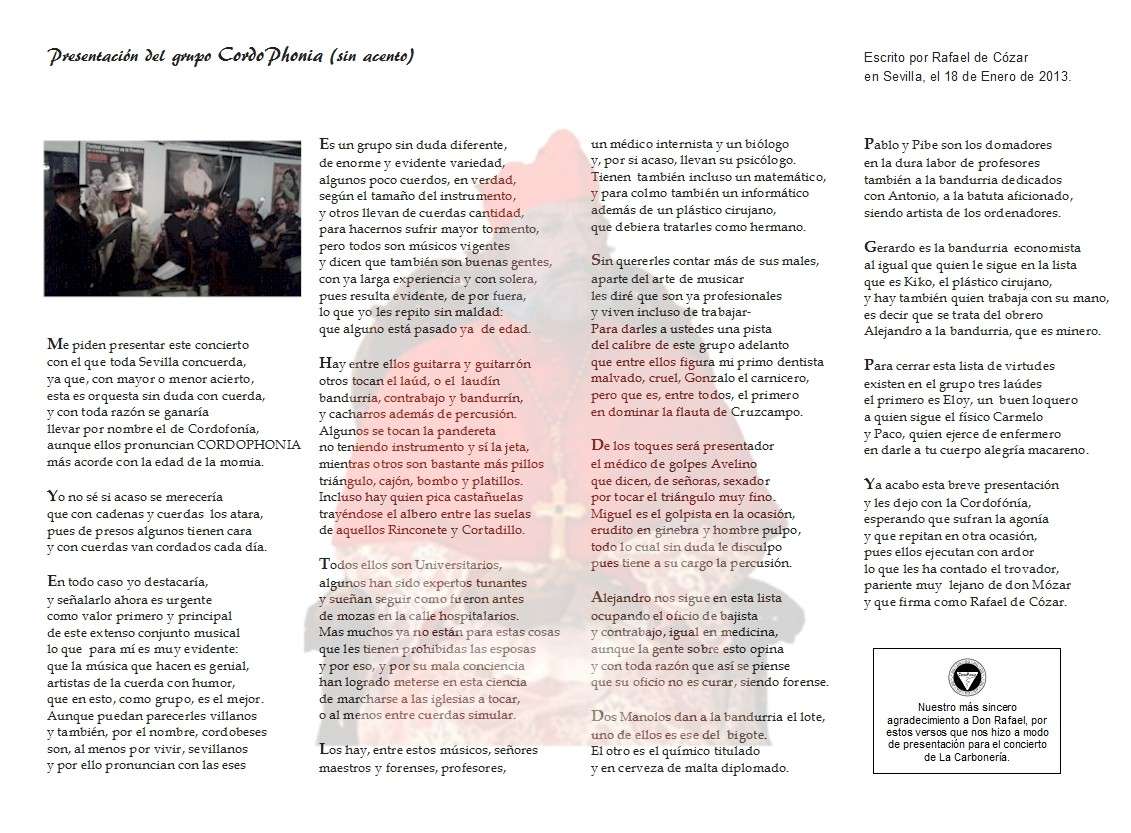 El poeta Don Rafael de Cózar tuvo a bien presentarnos en el recital que ofrecimos en el legendario bar «La Carbonería» de Sevilla, dedicándonos estas palabras ⬇⬇⬇