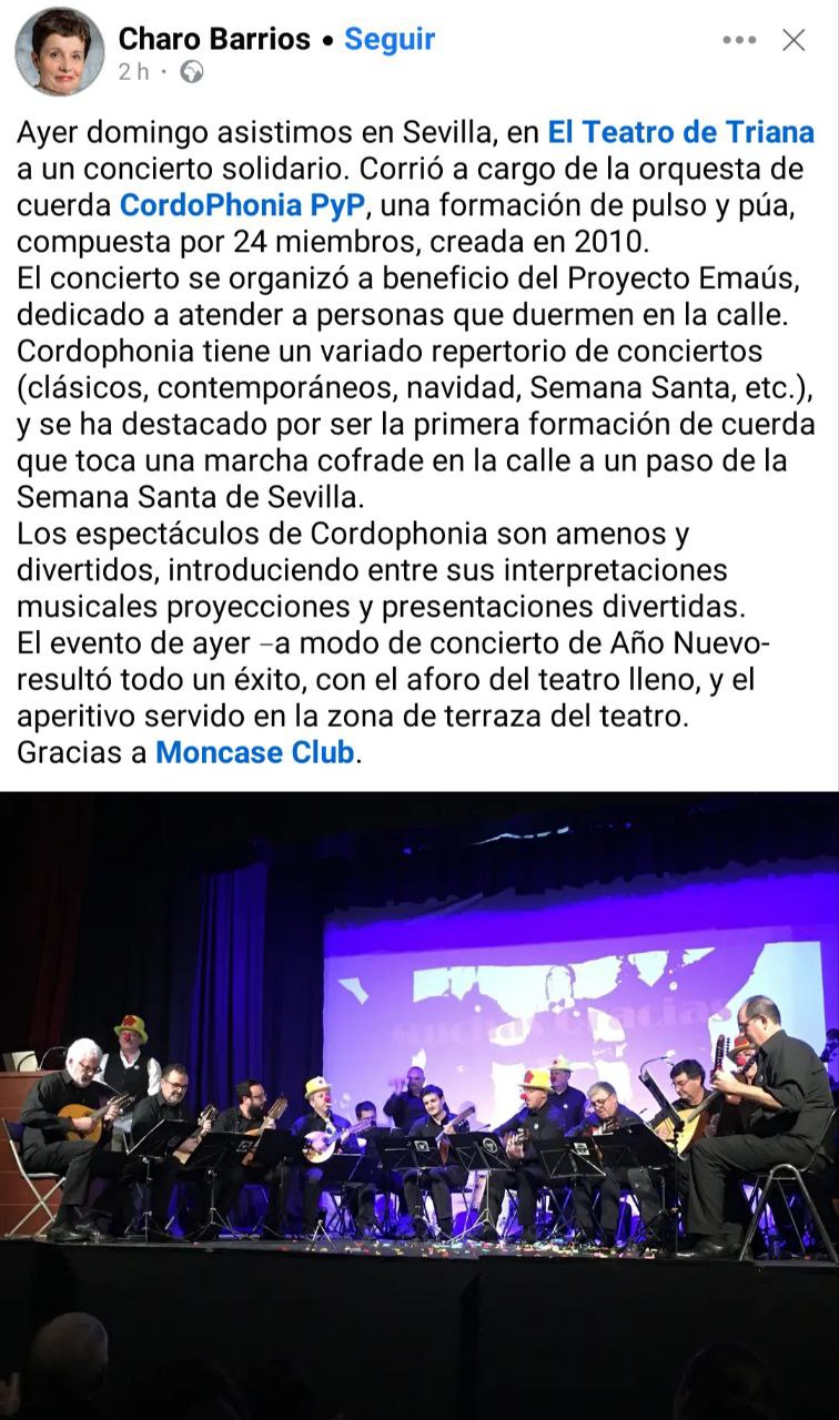 Opinión en Facebook de una asistente muy especial a nuestro concierto en Triana de enero de 2014 ⬇⬇⬇