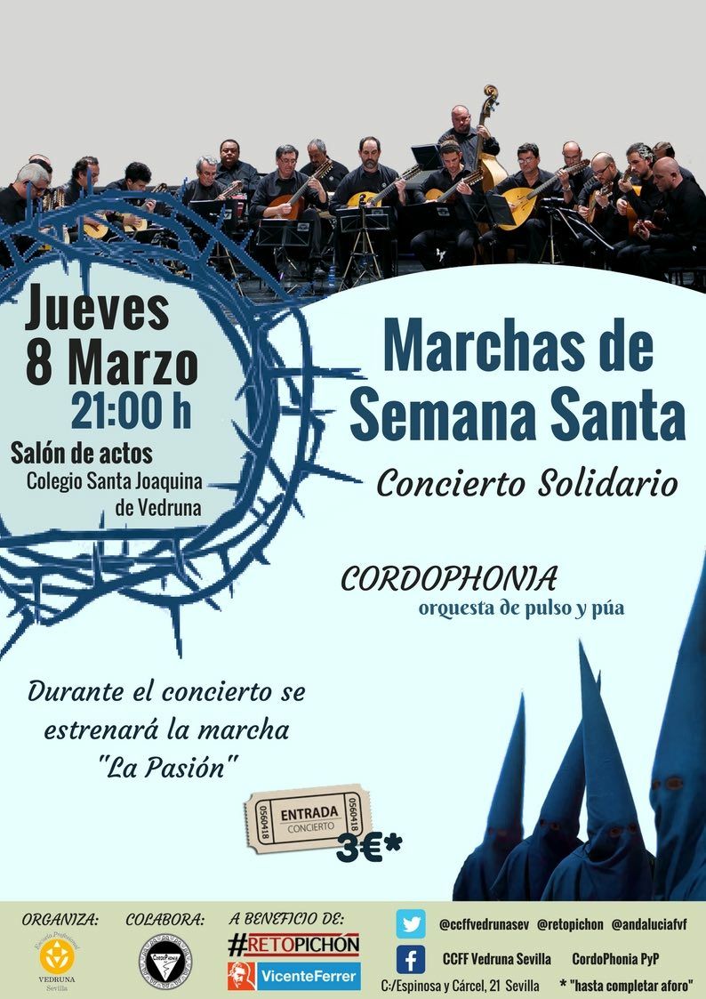 | 72 | 8 de marzo de 2018 |  | Concierto solidario a beneficio de «Reto Pichón» y la asociación «San Vicente Ferrer». Salón actos del Colegio Sta. Joaquina Vedruna. Sevilla | Música procesional |