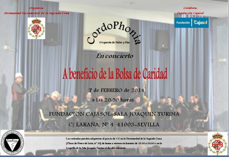 | 31 | 7 de febrero de 2014 |  | Concierto solidario a beneficio de la Bolsa de Caridad de la Hdad. de la Sgda. Cena. Sala Joaquín Turina – Centro Cultural Cajasol. Sevilla | CordoPhonia y los pájaros ibéricos |