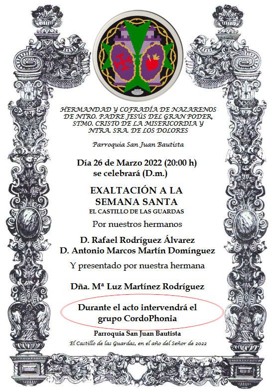 | 100 | 26 de abril de 2022 |  | Exaltación a la Semana Santa. Parroquia San Juan Bautista. Castillo de las Guardas (Sevilla) | Música procesional |