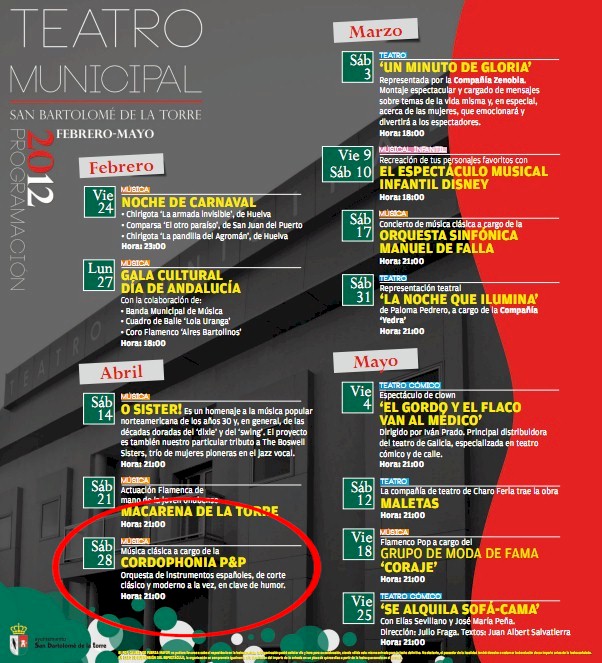 | 13 | 28 de abril de 2012 |  | Programación Febrero-Mayo 2012. Teatro municipal San Bartolomé de la Torre (Huelva) | Espectáculo «Arsa Púa» |