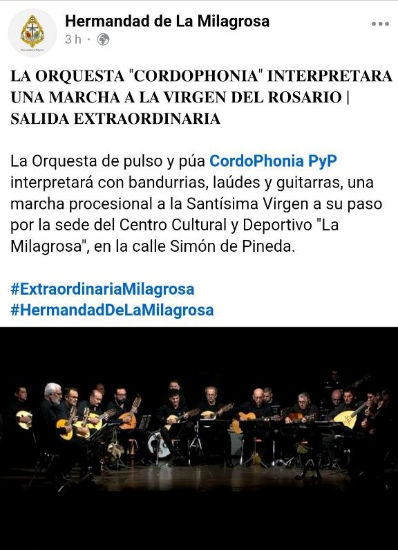 | 84 | 10 de abril de 2019 |  | Parroquia de La Milagrosa. Sevilla | Música procesional |