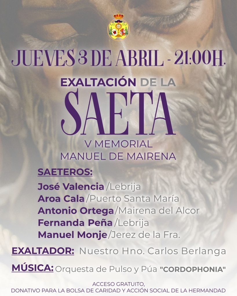 | 137 | 3 de abril de 2025 |  | V Memorial «Manuel Mairena», exaltación de la saeta. Santuario de la Hermandad de Los Gitanos, calle Verónica 6. Sevilla | Música procesional |